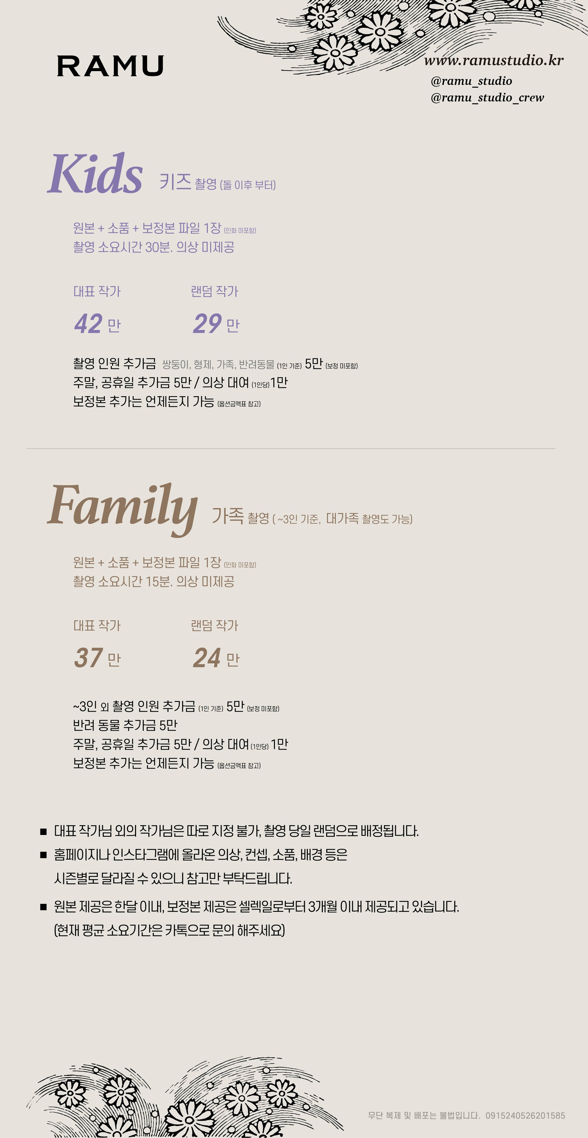 A 키즈 / 가족 촬영은 한가지 의상으로 자연스러운 분위기로 20 분 내외로 촬영해 드리고 있어요~ 키즈 / 가족 촬영 경우 의상은 옵션으로 제공되세요.